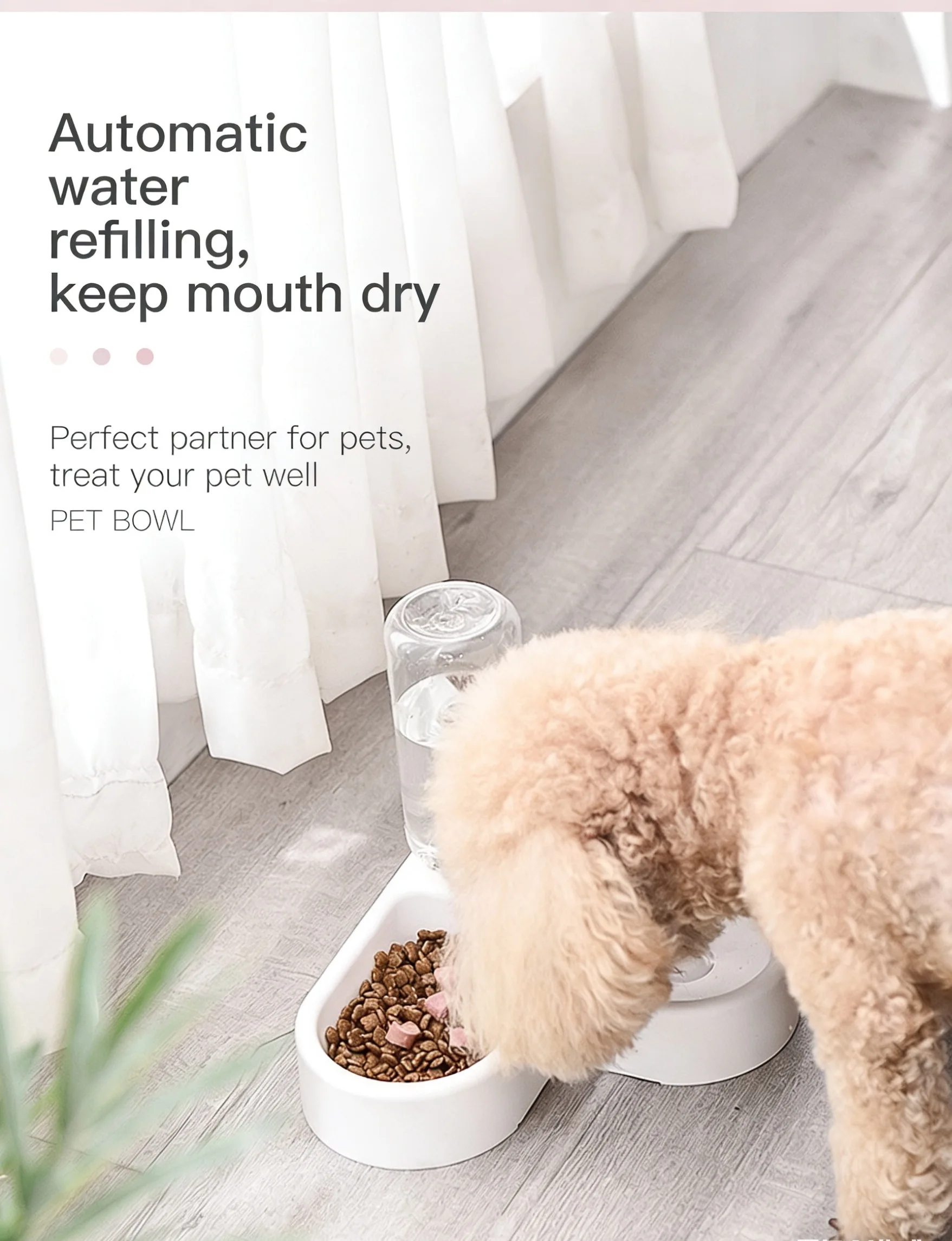 The gravity-fed water bottle (500ml capacity) continuously replenishes the water bowl, ensuring your pet has fresh water available all day without frequent refills.