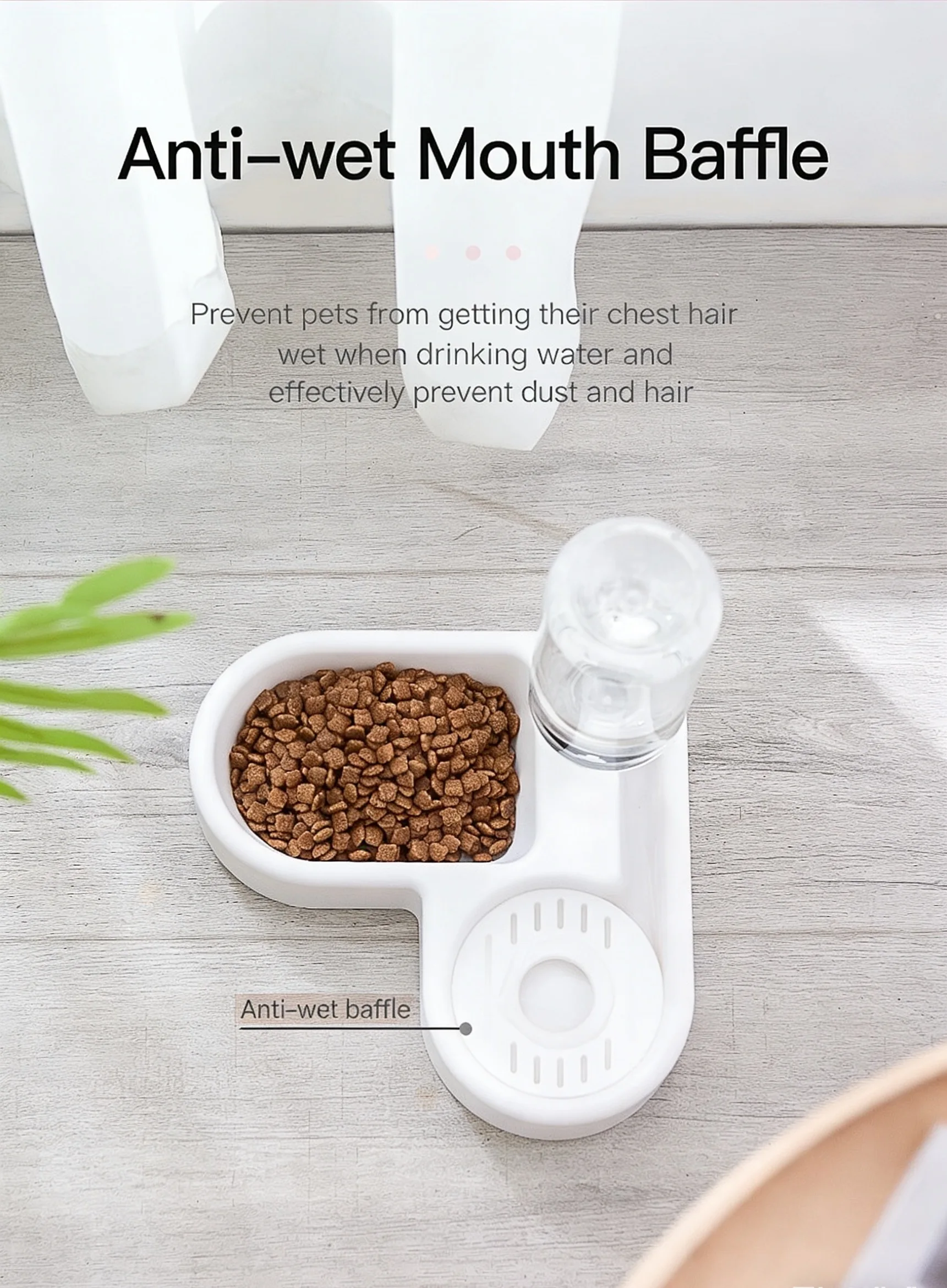 A built-in partition in the water bowl prevents pets from submerging their entire muzzle, keeping their facial fur dry and clean, while also blocking dust and loose hair from contaminating the water.